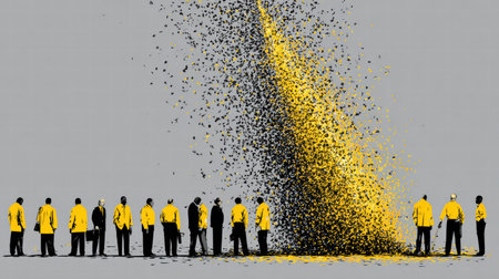 A businessman walks forward, gradually transitioning into a cloud of colorful particles, symbolizing transformation in an abstract setting.