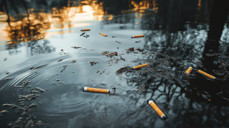 Polluted lake surface with oily reflections and scattered cigarette butts floating on top