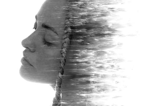 A portrait of a woman combined with digital art in a double exposure technique