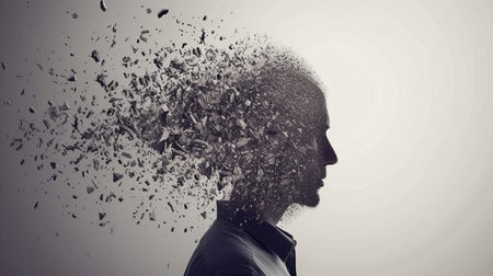 Mature mans face disappearing as dust particles, creating an abstract and conceptual representation of aging, memory loss, mental health issues, grief, and the passing of time