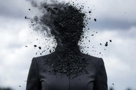disintegrating human figure in suit