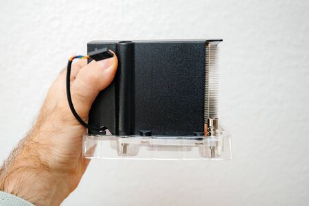 Man hand holding against white background computer heatsink cpu cooler with signage of the direction of airflow - side view