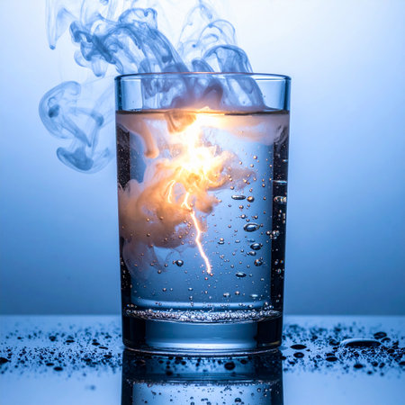 A brilliant flash of energy, like lightning, erupts inside a glass of water, causing a volatile reaction with billowing smoke.