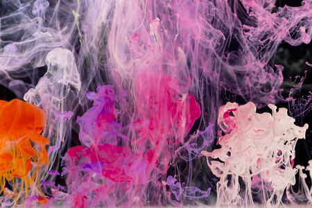 Abstract colored background. Pink smoke, ink in water, the patterns of the universe. Abstract movement, frozen multicolor flow of paint. Horizontal photo with soft focus, blurred backdrop.