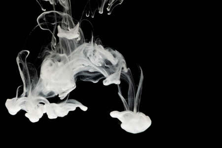 Drops of white ink in water. White abstract background. White watercolor ink in water on a black background.