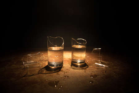 Drink, broken glass concept. Broken glasses on wooden table at dark toned background with fog. Selective focus