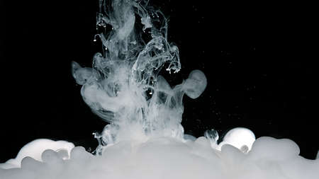 White watercolor ink in water on a black background. White abstract background. Waves of milky ink and splashes of white paints in the water.