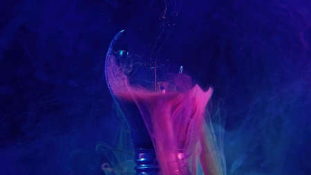 Ink water drop. Broken light bulb. Fantasy energy. Neon pink blue color smoke haze floating in cracked lamp glass on dark mist texture abstract art copy space background.