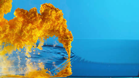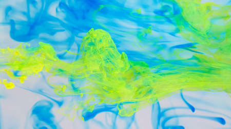 Drops of blue and yellow paint dissolved in water.