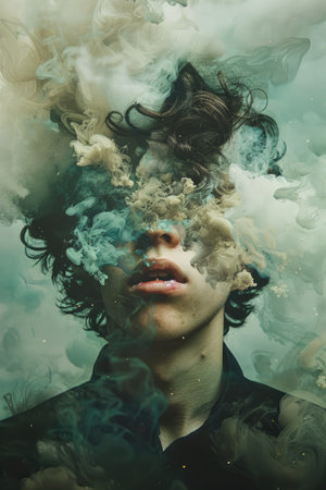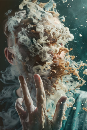 A man is covered in smoke and foam, with his hands raised in the air. Concept of chaos and confusion, as if the man is caught in a whirlwind of smoke and foam