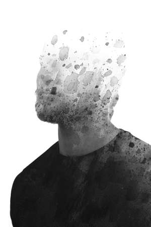 A man's head explodes with dark particles, representing inner turmoil or the disintegration of thought. He is in profile, with his mouth open in a silent scream. The background is a blurry, greyish white.