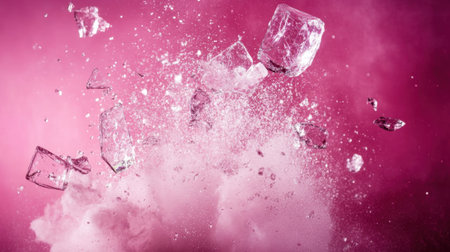 A stunning visual of ice cubes exploding against a vibrant pink backdrop, creating dynamic dust and particles that enhance creative projects and designs.