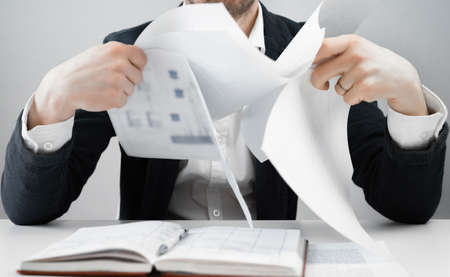 Cropped view of businessman works with financial papers at the table. Finance concept