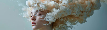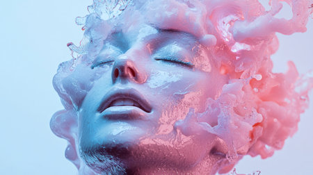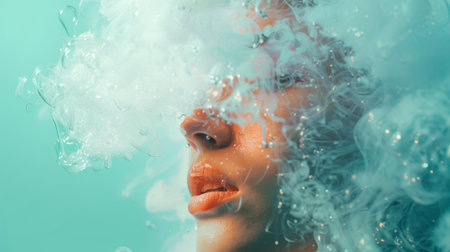 A surreal image of a woman's face submerged in colorful liquid, with her eyes closed and surrounded by fluid textures, evoking a sense of calm and otherworldliness.
