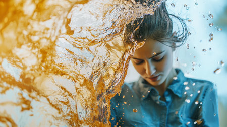 Dynamic portrait of a woman immersed in a burst of golden liquid splashing with sunlight, capturing movement and energy. Perfect for action and artistic concepts.