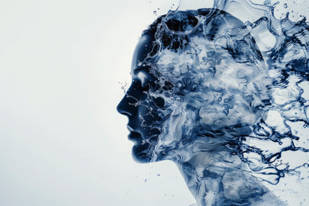 Water splashes in shape of woman head silhouette. Female portrait made of water waves with double exposure effect. People and nature concept