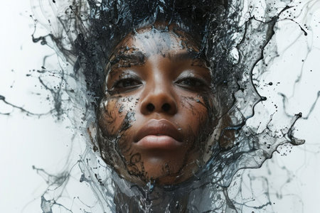 Paintography. A black and white portrait of a woman combined with ink splashes.