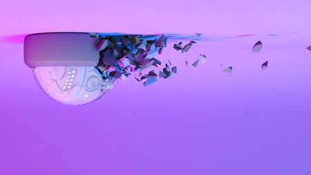 cctv camera in neon purple light falls into pieces, 3d illustration