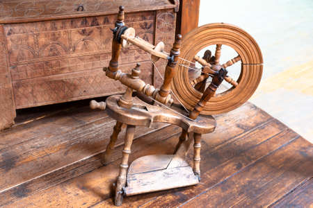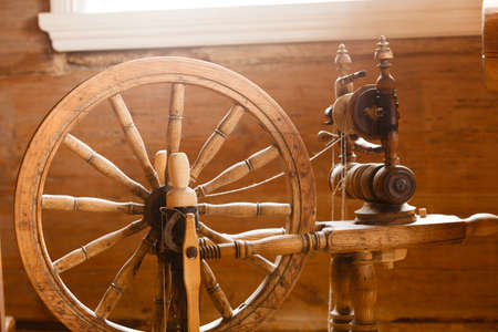 Old spinning wheel. Vintage tailoring equipment concept.