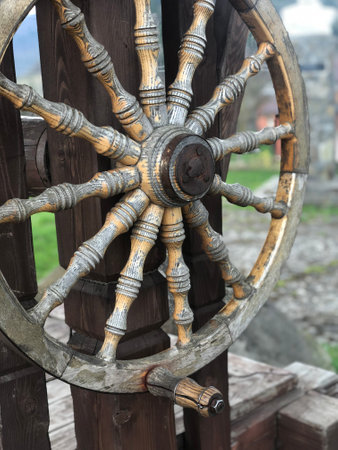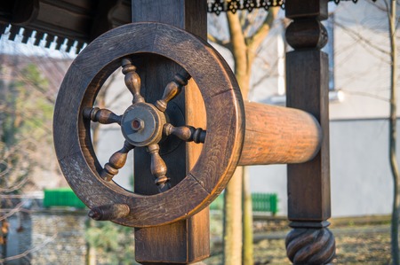 Closeup view on steering wheel of the ship, outdoors background