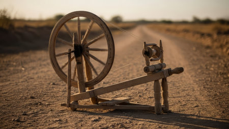 Old-fashioned spinning wheel, dusty rural path, warm sunset light
