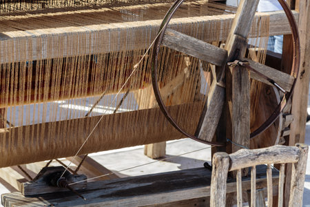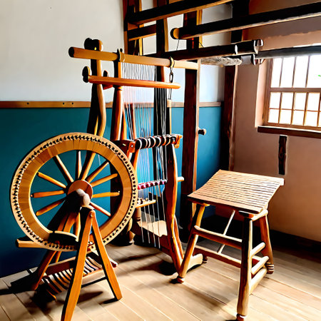 This image captures an antique weaving loom set in a traditional workshop, highlighting the intricate details of textile craftsmanship and artistry.