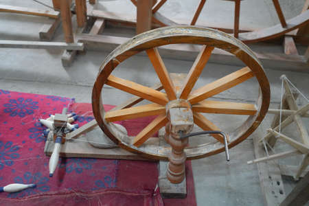 Antique wooden charka in gujarat india for making cotton khadhi. These different designs were used during the indian fight for independence and is a symbol of mahatma gandhi and his satyagrah