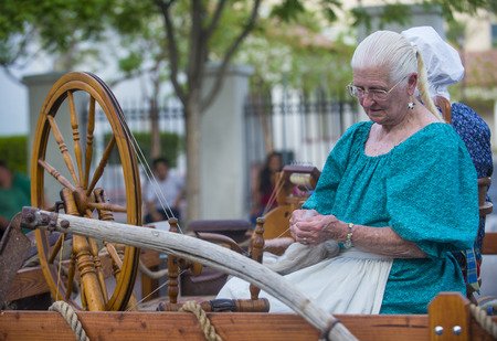 View of young woman spinning thread. Traditional Folk Art. Movement.