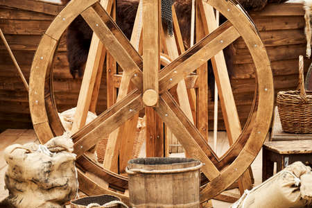 Close up of the detail of a wooden vintage spinning wheel during an exhibition in a medieval fair