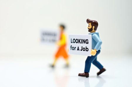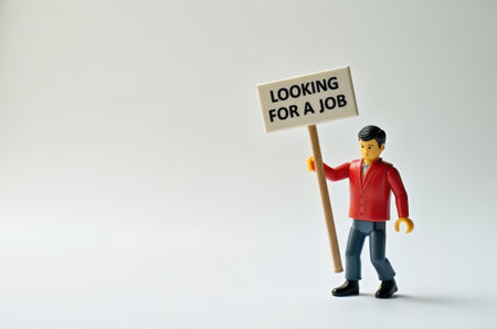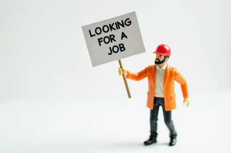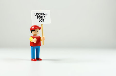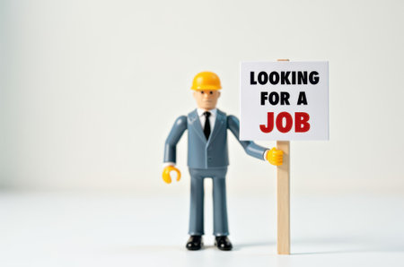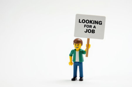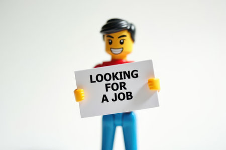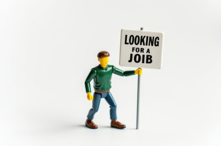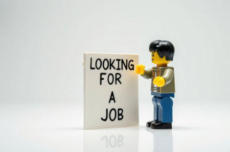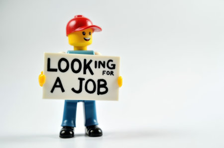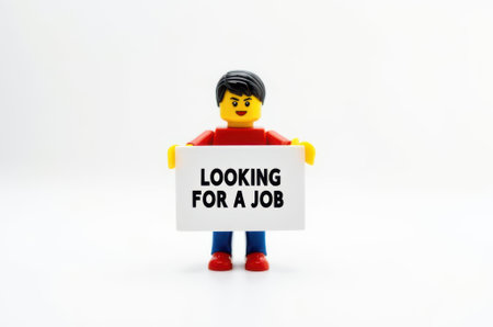 Close up of Lego figure holding a sign with the word LOCKING FOR A JOB. Studio shot.