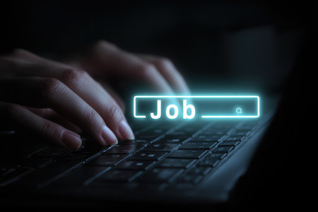 A close-up view of hands typing on a laptop keyboard with a glowing job search bar displayed. The dark background creates a focused, tech-inspired atmosphere for career seekers.