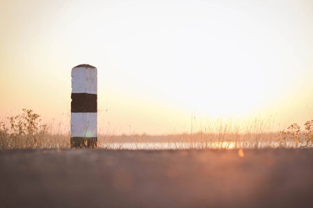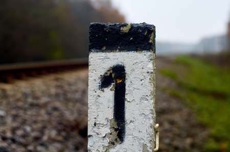 Border mark on the border of the Polish-Czech state, the post stands along the hiking trail on a cold, foggy day.