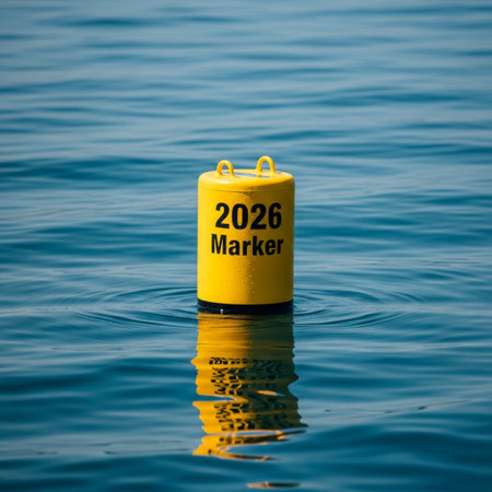 Yellow buoy with the inscription 2019-2020 on the water surface.