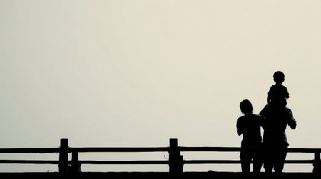 Silhouettes of parents walk on boardwalk with child on shoulders. The sky is blank, and the scene captures a moment of family fun.