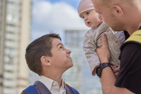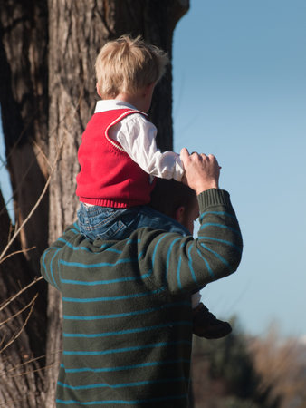 Young caucasian father holding his son toddler. Baby touching the face of his dad. High quality photo