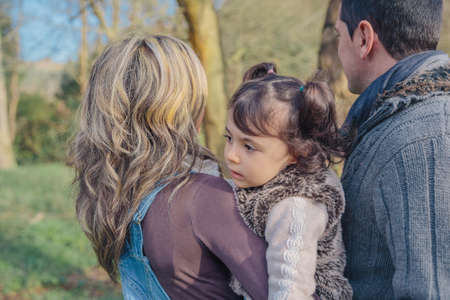 Portrait of a happy family in the park. Mother, father and their daughter.