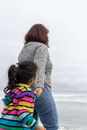 Little girl daughter hugs a woman to her mother on the beach. happy modern mother and girl child on seashore in the evening having fun time. mother with little daughter on beach vacation