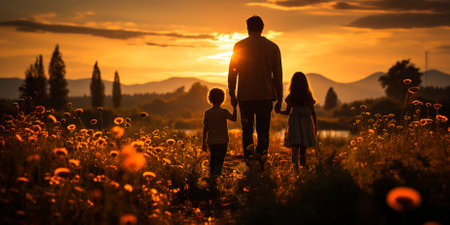 Wide view image of silhouette of a family with two kids holding hands by the sea looking in to the distance.