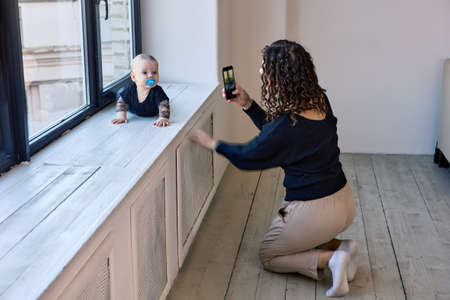 Child passion and hobbies concept. Kid playing with big professional digital camera, photographing various things in house, mother looking after him.
