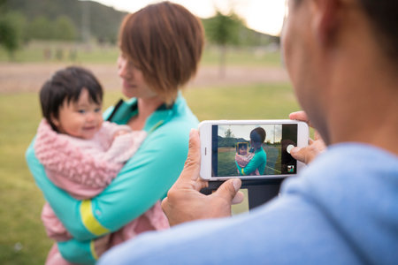 man taking photo of his beautiful wife and adorable child, free and spare time, lifestyle