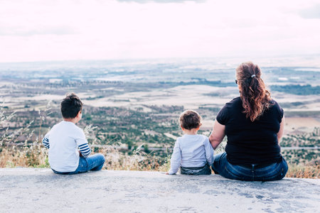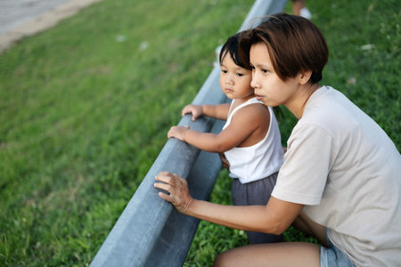 Family portrait of mother and her young son in the park. Family leisure outdoors in the natural landscape