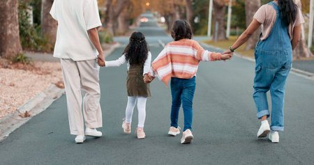 Back, family and holding hands in the street, walking and healthy with quality time, wellness and bonding. Parents, mother and father with children, road and travel with support, commute and hobby