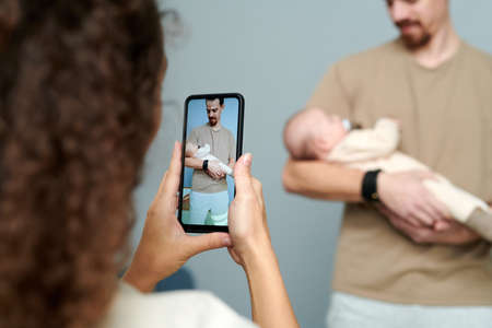 Father holding baby son on screen of smartphone held by young woman taking photo of her husband and their newborn child