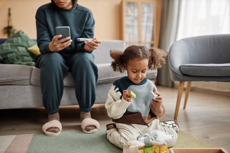 Full shot of African American girl with two ponytails playing with toys on living room floor while unrecognizable mother on sofa holding smartphone and thermometer