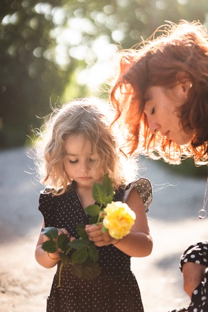A mother holding her little daughter's hand in the field. Concept of love between mother and young daughter