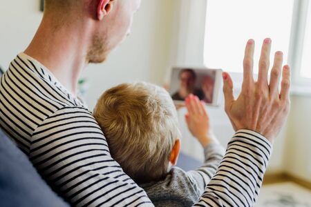 Father and son having video call to mother using tablet. Family communicating through the Internet