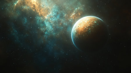 This stunning image captures a vivid cosmic scene featuring a planet surrounded by vibrant nebula and countless stars, evoking a sense of wonder.