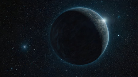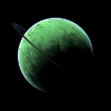 3D rendering of an alien planet in space against a background of stars
