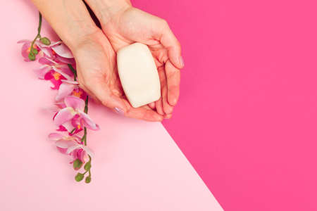 Female hand holding piece of soap against pink background. Top view
