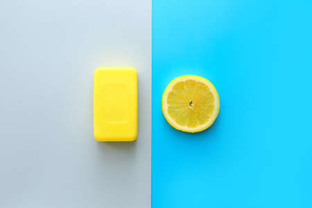 Soap bar with lemon slice on color background